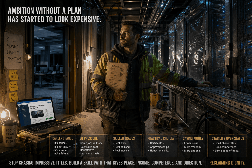 A man stops laughing at the idea of trade school. He asks what an electrician actually earns. He watches videos about automation instead of motivational clips. He updates his CV but does not send it yet. He stays late one night, not out of loyalty, but because he is studying the system. He stops buying useless stuff because he may need six months of runway. He takes the boring course because boring might pay. He stops asking, “What sounds impressive?” and starts asking, “What still exists in ten years?”
